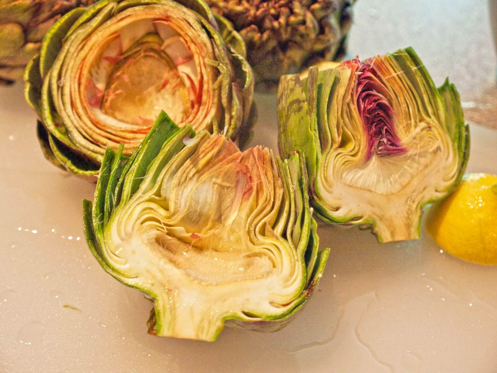 Slice the artichoke in half to expose the center cone of purple leaves and the fuzzy choke. Remove the leaves and use a spoon to remove the choke. This is the way I prefer to do it.