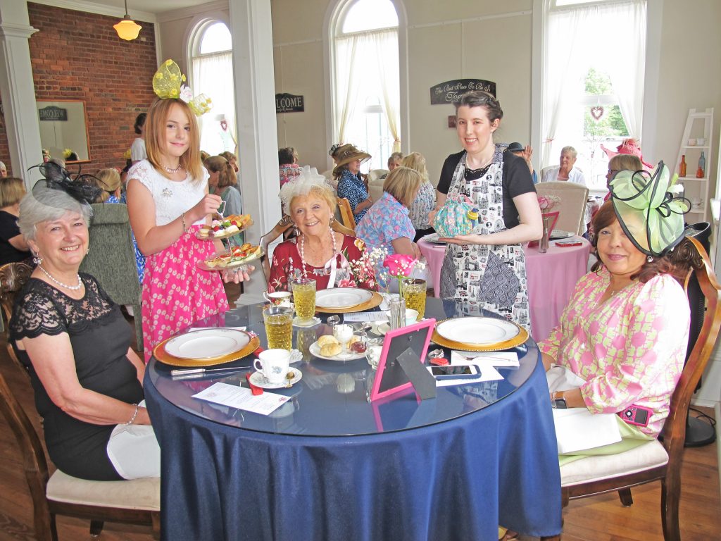 RIDGEWAY – Barclay School student Claire Hood, 11, standing left, serves a triple tray of sweets during a Royal Tea fundraiser for the school at Laura’s Tea Room in Ridgeway Monday in celebration of the Royal Wedding on Saturday. Tea Room wait staff, Sarah McElmurray, pours tea. Carol Allen, owner of the Tea Room, donated profits from the afternoon High Tea to the school for scholarships. Students served with the help of the professional wait staff and handed out raffle prizes during the social event.