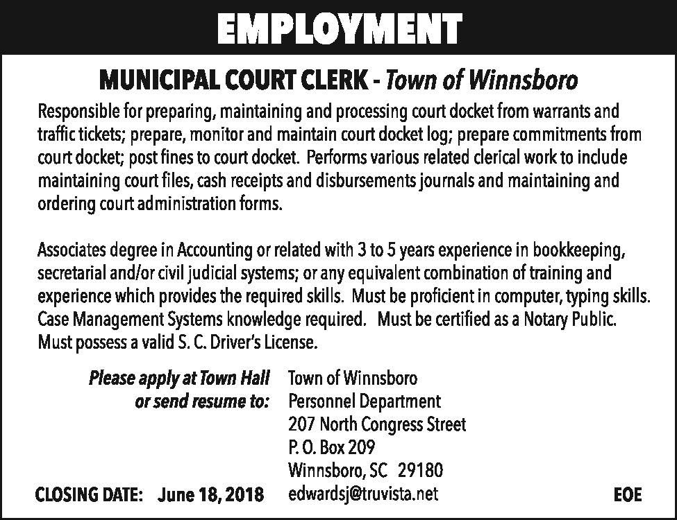 EMPLOYMENT: Town of Winnsboro Municipal Court Clerk