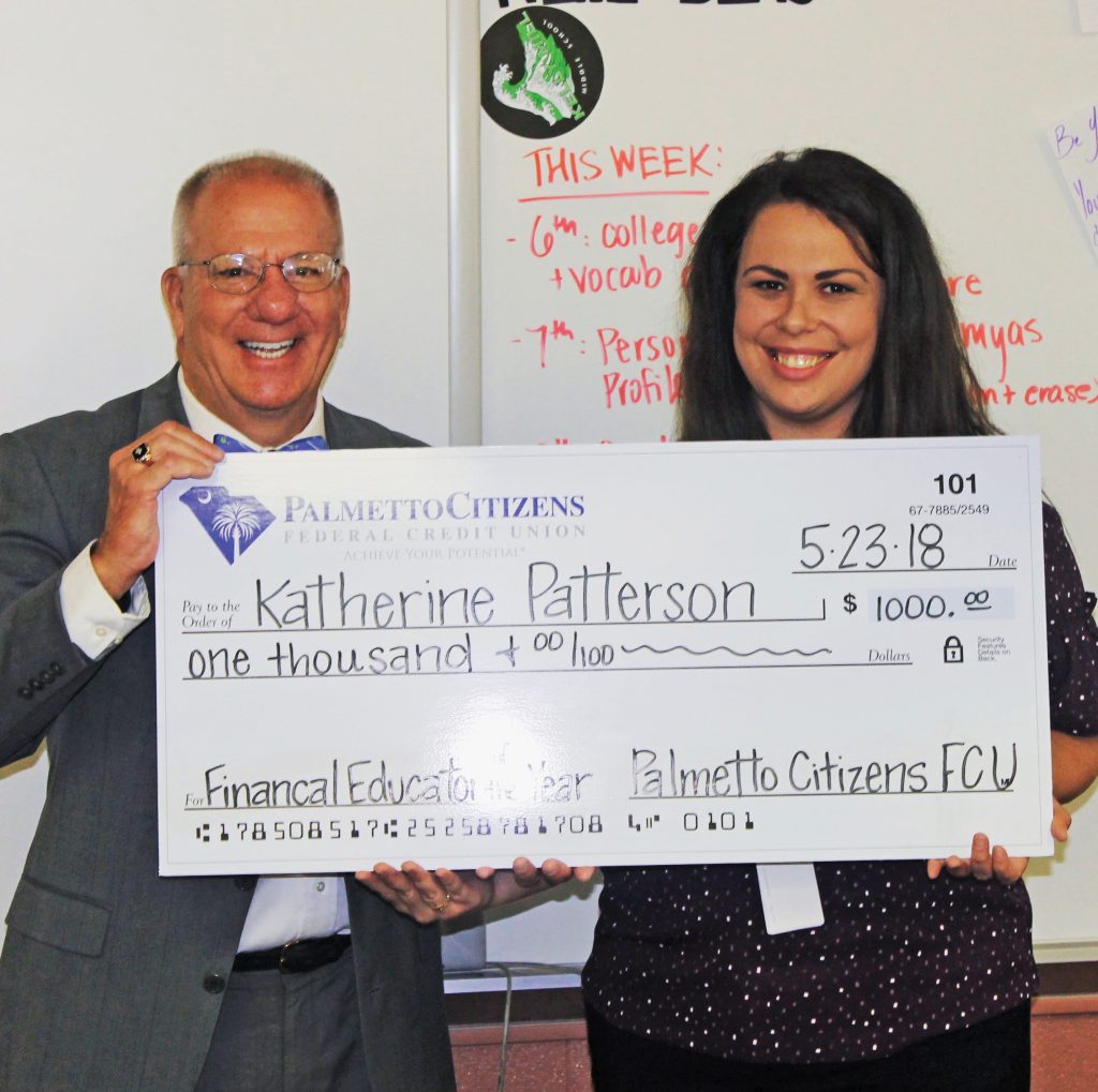 BLYTHEWOOD – Palmetto Citizens CEO Nick Wodogaza and presents Kelly Mill Middle School teacher, Katie Patterson, with a $1000 check for being Palmetto Citizens Financial Educator of the Year.