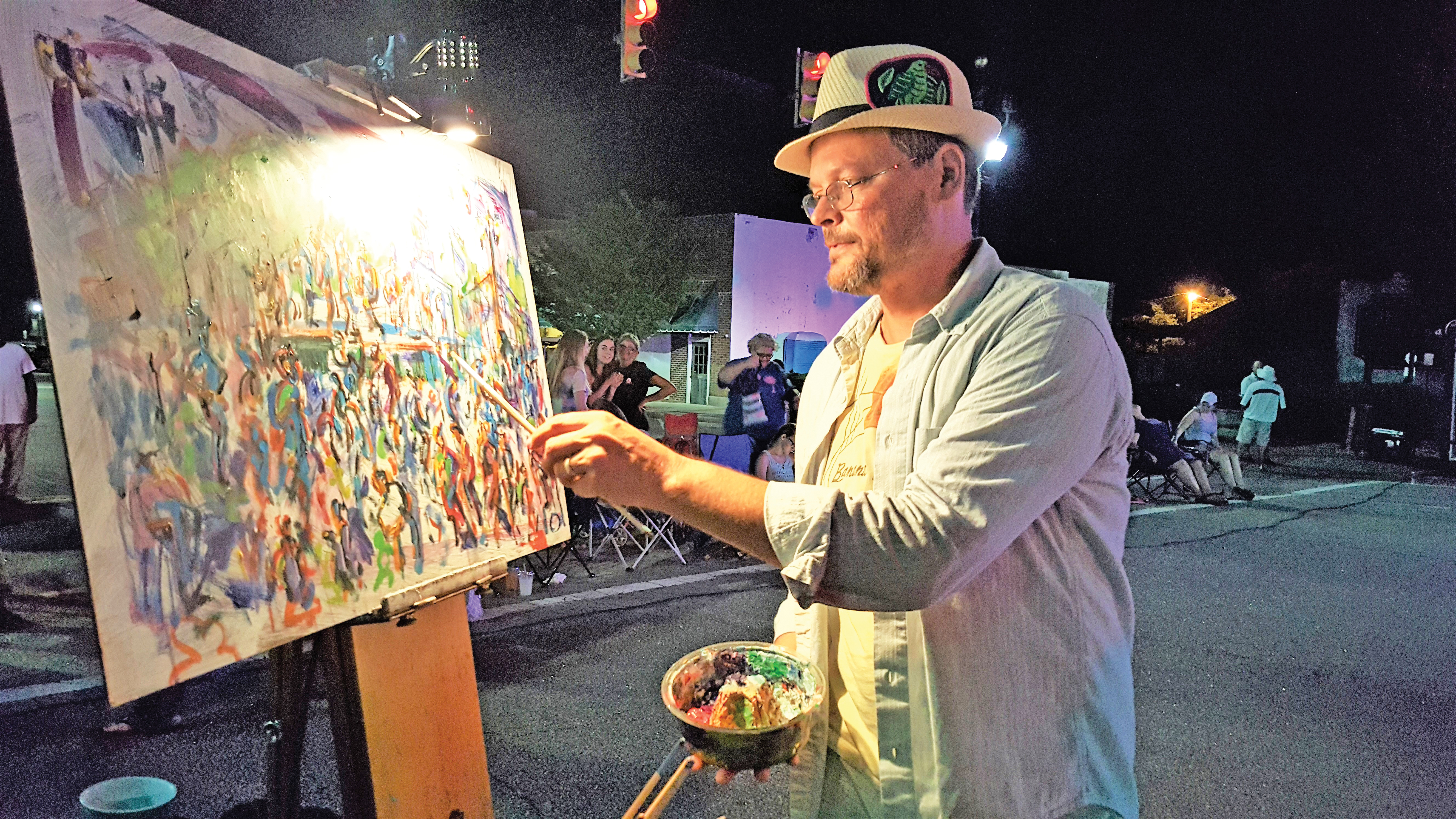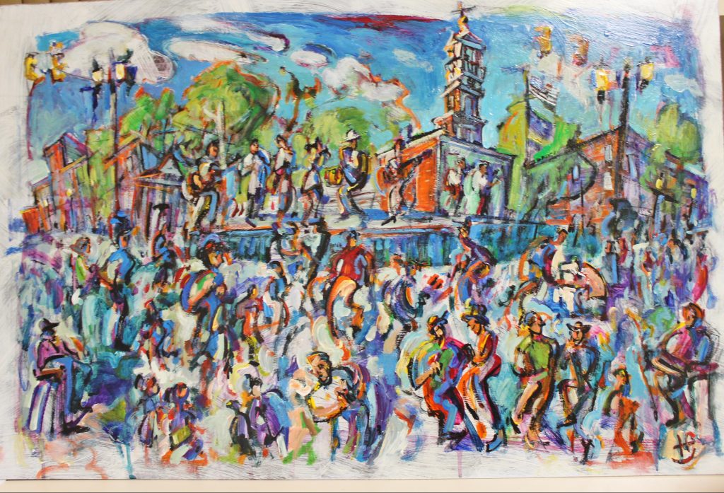 To make it a weekend to remember for her classmates, Lyles commissioned local interpretive artist, Trahern Cook, to capture the moment on canvas as the reunion attendees and others danced the night away in the street in front of the town clock. She planned to auction the painting at the end of the evening to pay Trahern’s $300 fee.