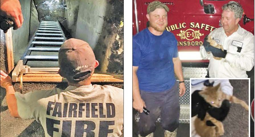 WINNSBORO – An evening phone call from a concerned CVS customer about hearing a cat down the parking lot storm drain turned into a four-hour, multi-department rescue effort. Fairfield County fireman Jay Joyner lowered the truck’s ladder into the storm drain for Trip Peak, Town of Winnsboro Director of Gas, Water and Sewer, and Mikey Bunting, Gas, Water and Sewer Foreman. The two crawled approximately 150 feet through the storm drains before locating the trapped kitten, which is now at the Fairfield County Animal Shelter awaiting adoption.