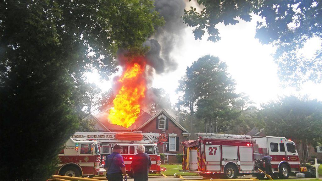 BLYTHEWOOD – Approximately 30 firefighters responded to a call around 4:30 p.m. Monday for this Crescent Lake home on Winding Wood Court. Parts of the roof collapsed on the home, but no injuries have been reported. The home was formerly a stop on the Parade of Homes.