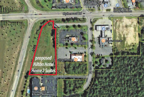 BLYTHEWOOD – Hilton Hotel’s Home 2 Suites is considering putting down roots in Blythewood. The hotel’s owners are seeking permission from the Town to build a four-story, 88-bed hotel building on a 1.93 acre vacant lot adjacent to the I-77 ramp. But without considerable adjustments to the entrance to the property, the 55,672 square foot building would have no direct access to Creech Road.