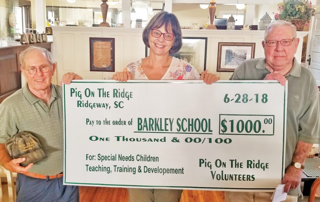 RIDGEWAY – Pig on the Ridge committee representatives Tom Connor and Henry Dixon present a check for $1,000 to the Barclay School to help fund its fledgling program for students who learn differently. Below, they also donated $300 to Geiger Elementary Principal Myra Bramlett for the school’s “Look For The Good Project” that the school implemented for the coming school year.