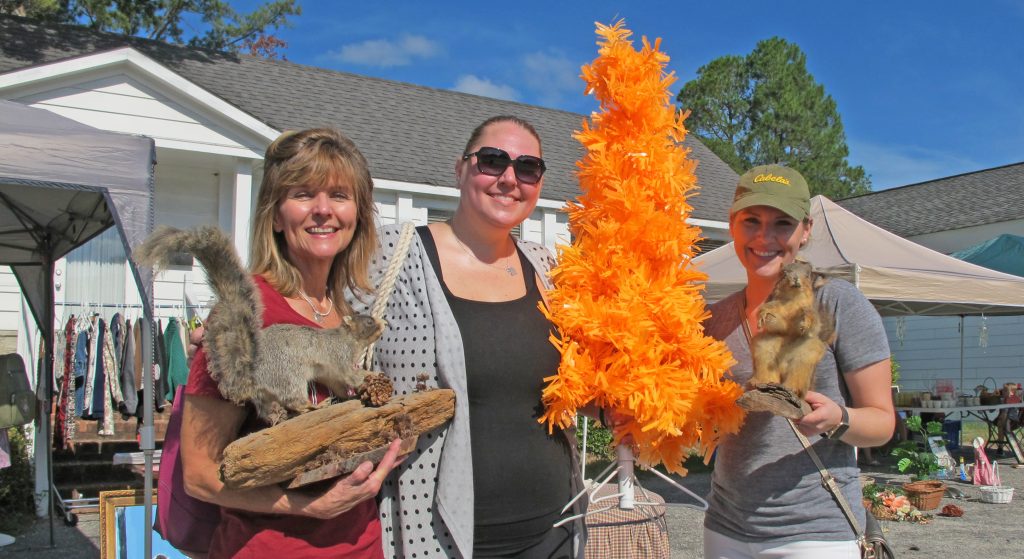 Candice Bray, Christina Kyzer and Lisa Bray show off their finds – two stuffed squirrels from Blythewood Consignment and an orange artificial Christmas tree. | Photos: Barbara Ball