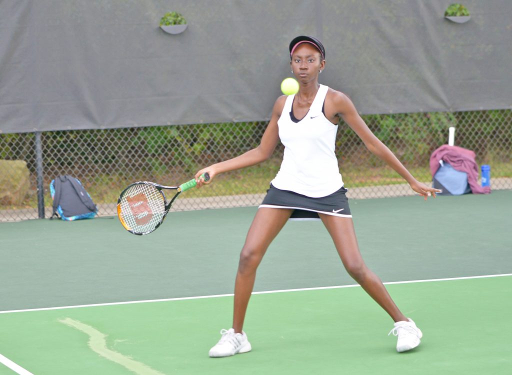 WINNSBORO – Sylvanie Johnson (above) attacks with a strong forehand stroke in her win against a Newberry opponent. Cherise Trapp, Krishayla Boyd, Janelle Green, and Ashanti Thompson each also picked up wins for the Griffins last Tuesday night in a conference matchup with Newberry High School. Jacia Green and Alaina Hopkins capped off the 6-0 victory with an easy win in doubles competition.