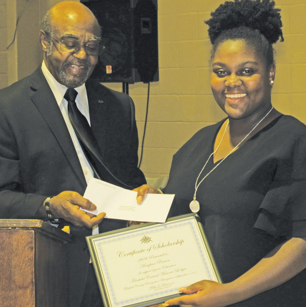 On behalf of the Fairfield Masons, District 6 Special Deputy Willie Pinson awarded a $1,000 scholarship to Fairfield Central High School graduate Meeghan Pearson. Recognition and appreciation were given to a number of masons and their family members for support and dedication. Eddie and Jackie Nelson of Nelson Funeral Home were recognized for their generous donations to the Masons.