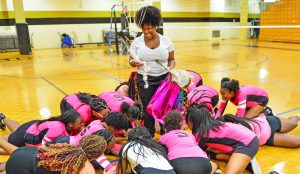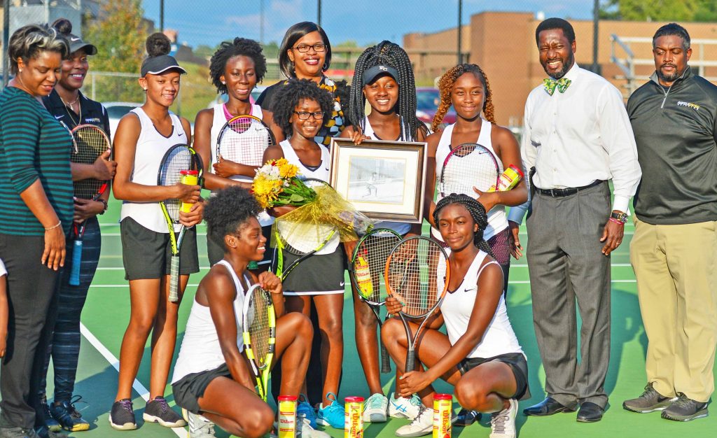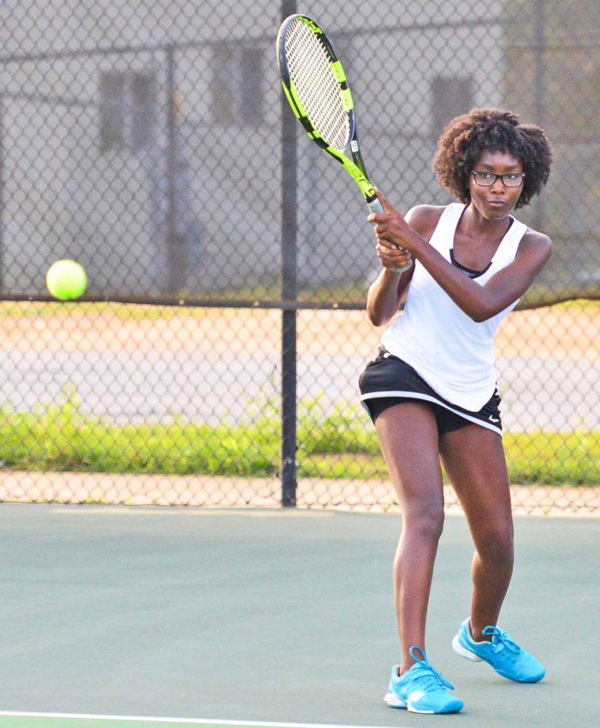 WINNSBORO – Tuesday night was senior night for the Fairfield Central Griffins tennis and volleyball programs. The tennis team swept through Indian Land with ease with a perfect 6-0 win over Indian Land. Jacia Green, Ashanti Thompson, Krishayla Boyd, Charisse Trapp and seniors Janelle Green, above with flowers, all picked up wins in singles competition. Jacia Green and Sylvanie Johnson capped off the night with a win in doubles.