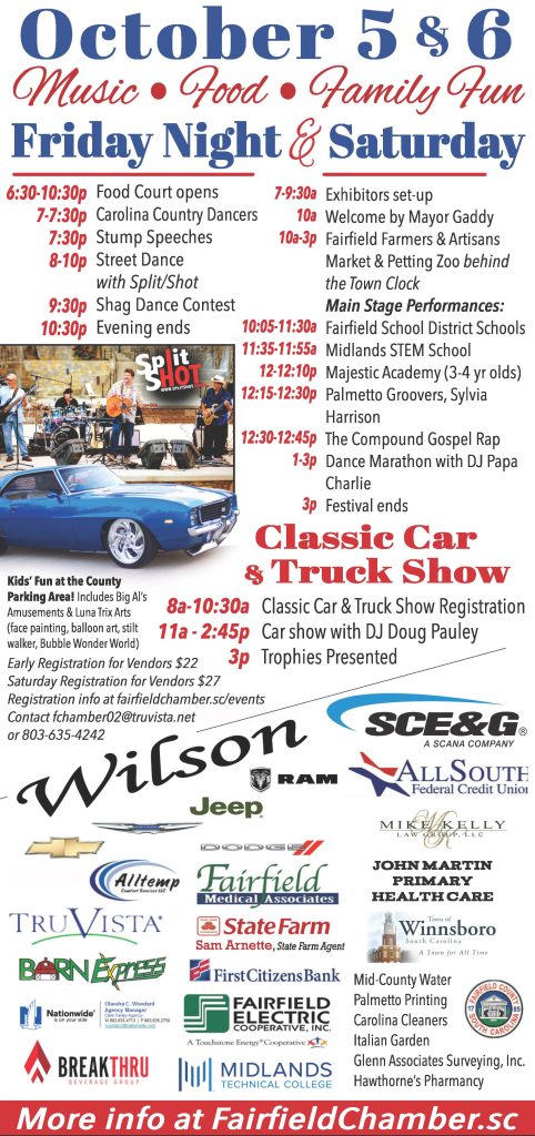 Mayor Gaddy will open Saturday’s festivities at 10 a.m. to welcome festival goers. The Fairfield Farmers & Artisans Market and a petting zoo behind the Town Clock will be open 10 a.m. – 3 p.m.