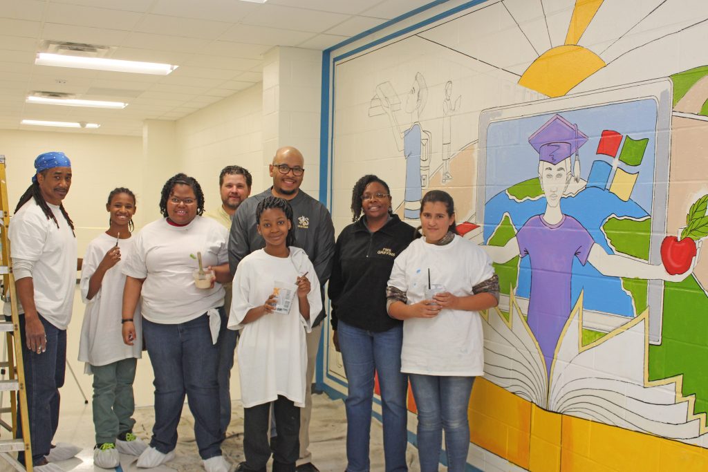 WINNSBORO – Renowned child advocacy artist George E. Miller II served as Fairfield Middle School’s (FMS) Artist in Residence for two weeks planning and creating a mural with thirteen students to showcase their talents beyond the classroom. Ideas for the mural were created by the students and sent to Mr. Miller, who compiled the ideas into one theme. The thirteen students painted on a rotating basis throughout the two weeks. The mural was unveiled in a ceremony on Nov. 2.