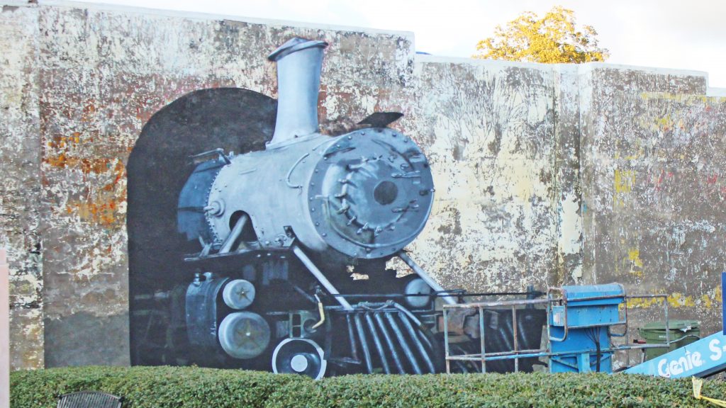 WINNSBORO – Airbrush artist Dru Blair and several of his international students put the finishing touches on a life-size Trompe-l’œil train mural on a wall across from the town clock in downtown Winnsboro last week. The artists will return next year to complete the wall scene around the tunnel.