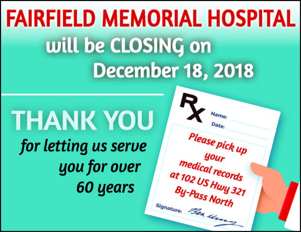 FAIRFIELD MEMORIAL HOSPITAL will be CLOSING December 18, 2018. Please pick up your medical records at 102 US Hwy 321 By-Pass North.