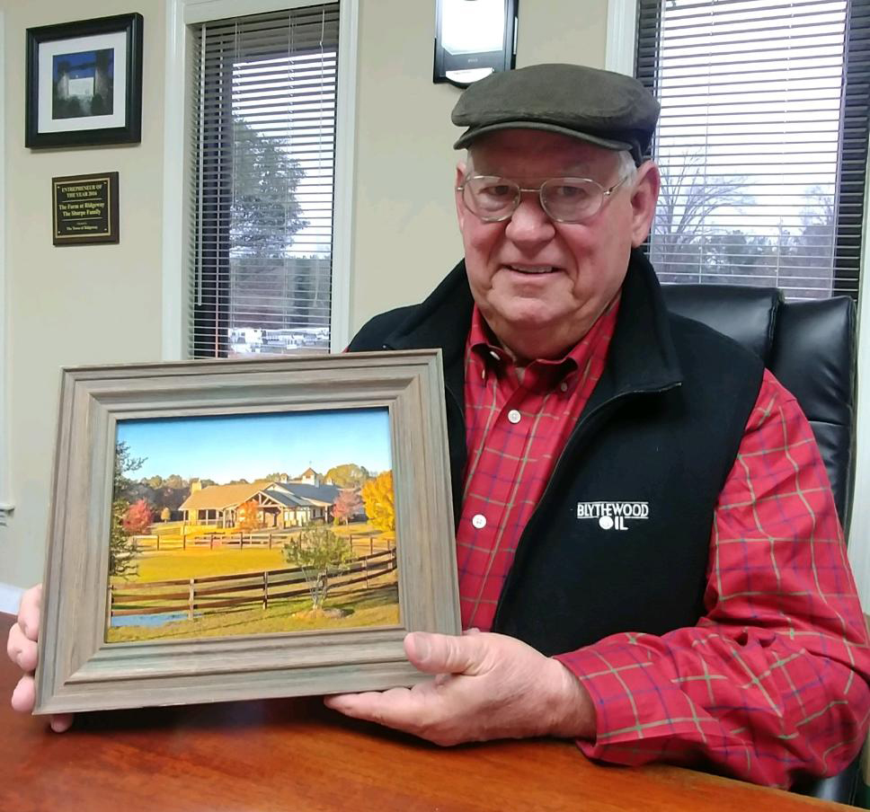 BLYTHEWOOD – Larry Sharpe, above, owner of The Farm at Ridgeway, received this photo of The Farm from the Hoof & Paw Benevolent Society as a token of their appreciation for donating the use of the venue for Hoof & Paw’s recent reception and unveiling of their coffee table book. More than 200 people attended the event where those whose animals appeared on the pages of the book were given free copies of the book. The photo of The Farm was taken by Blythewood photographer Dr. Robert Buchanan.
