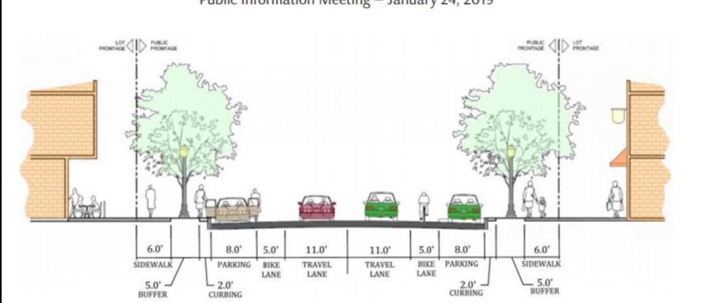 The first option presented from the program included a 75 foot roadway that would then have sidewalks and bike lanes to be lined with detailed landscaping. The plans also allowed space for on-street parking along the roadway and a roundabout to be installed at the street’s intersection with Boney Road.