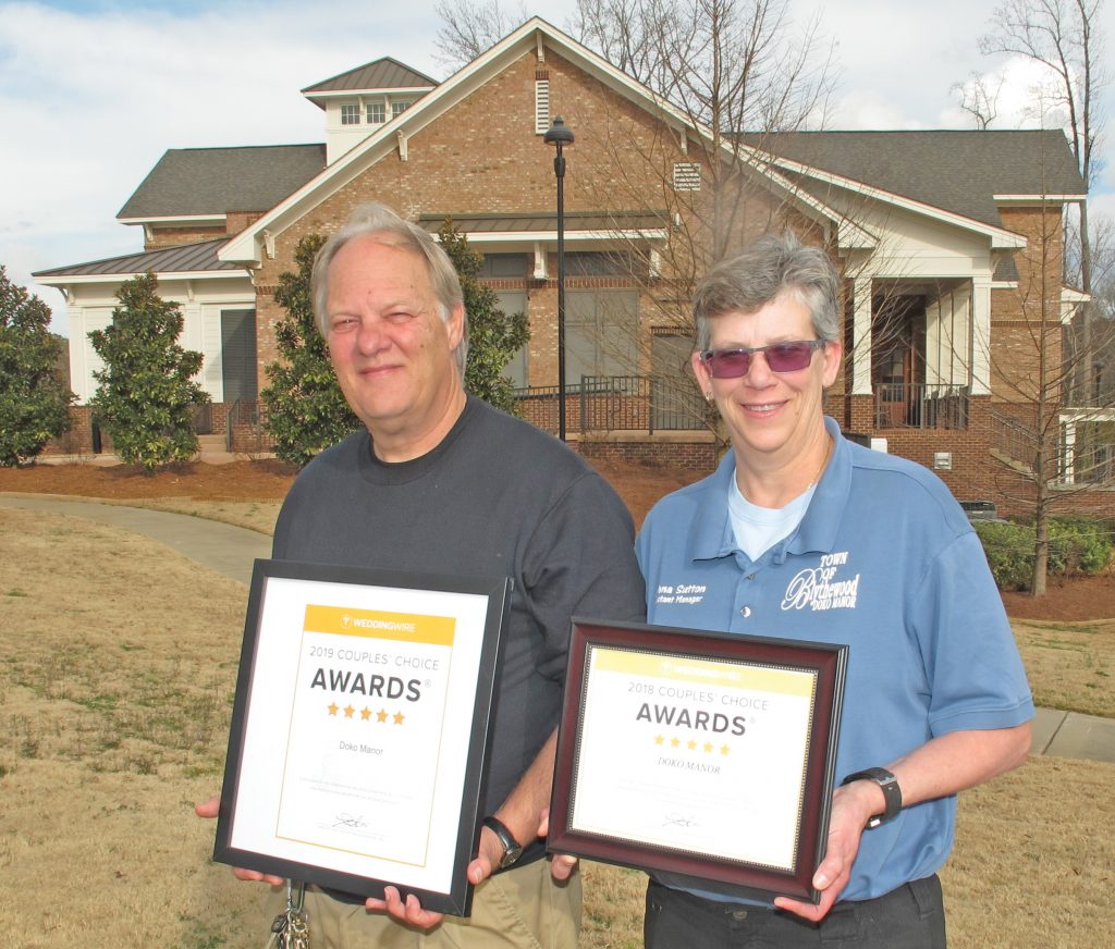 Steve Hasterok, Director of Conference Center and Events, and Johnna Sutton, Assistant Manager of Doko Manor, display plaques designating The Manor as the winner of Wedding Wires Couple’s Choice award for the second year in a row. | Barbara Ball