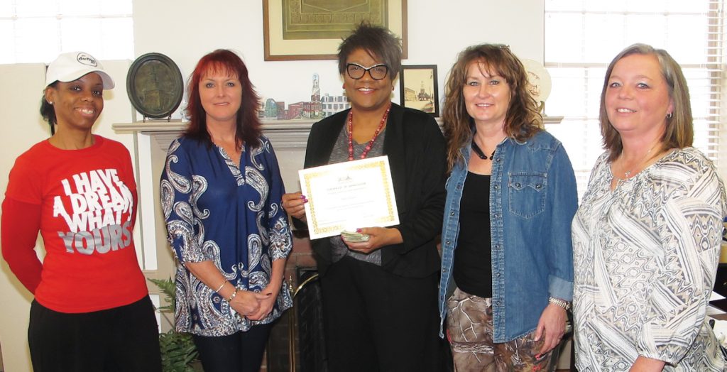 WINNSBORO – The merchants of downtown Winnsboro sold and displayed pink paper hearts for $1 during February to raise money for the homeless in the community. During the weekly merchant meeting on Friday, the money raised ($150) was presented to Bleva Bush Belton for the Closet to Closet ministry she runs in the Gordon Odyssey building for Fairfield County homeless students and their families. Presenting the funds to Belton are merchants, from left, Crystal Paulk (The Donut Guy), Vanessa Reynolds (Sunshine & Serenity), Belton, Wanda Carnes (Artists Coop) and Valery Clowney (farmers’ market).