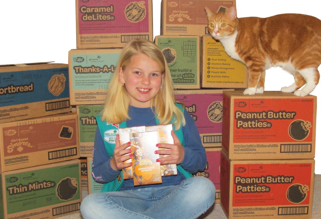 Haley Autry’s cat, Willow, assists as Haley shows off the growing stack of Girl Scout cookies that she plans to donate to Oliver Gospel Mission residents. | Barbara Ball
