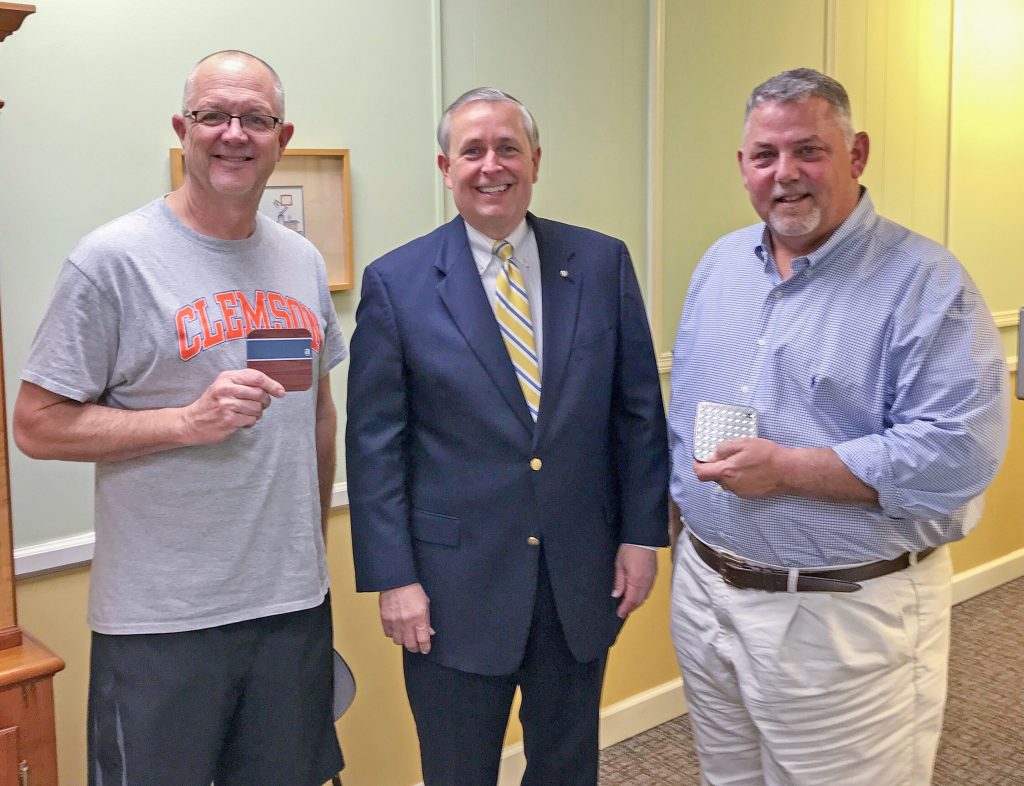 WINNSBORO – March Madness has come to an end with more than Virginia winning. The office of Dr. Philip C. Wilkins, pictured center, and Dr. Reid P. Warren sponsored their 5th annual March Madness bracket challenge. The first place prize, a $300 Visa Gift Card, was awarded to William ‘Bill’ Stidham, right, of Winnsboro. The second place prize, a $150 Visa gift card, was awarded to Joel ‘Eric’ Johnson, left, of Winnsboro.