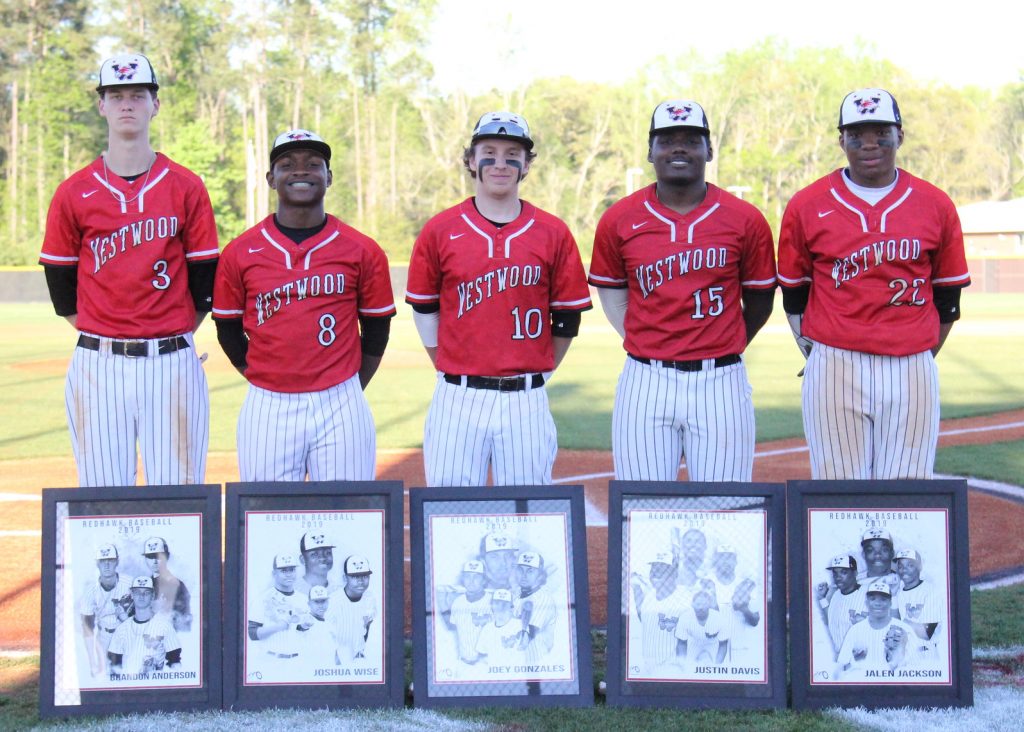 Westwood celebrated their seniors April 10 at home against South Pointe. The Redhawks took down the Stallions 8-7. Pictured above, from left, are seniors Brandon Anderson, Josh Wise, Joey Gonzales, JD Davis and Jalen Jackson. | Leroy Howard