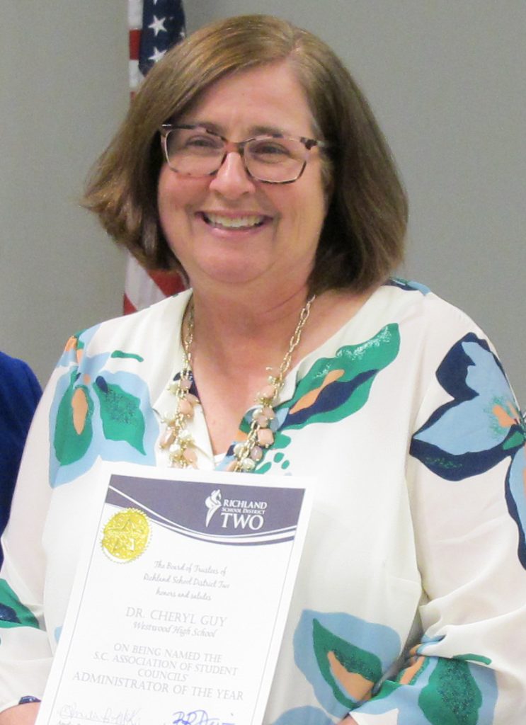 BLYTHEWOOD – Westwood High School Principal, Dr. Cheryl Guy, has been named the S.C. Association of Student Councils’ Administrator of the Year. Guy’s administration supports Westwood’s student council in many ways – by providing a thank you breakfast for student government members every year, organizing the floats for the Blythewood Christmas parade, participating in dress days, no matter how crazy, and speaking at pep rallies.