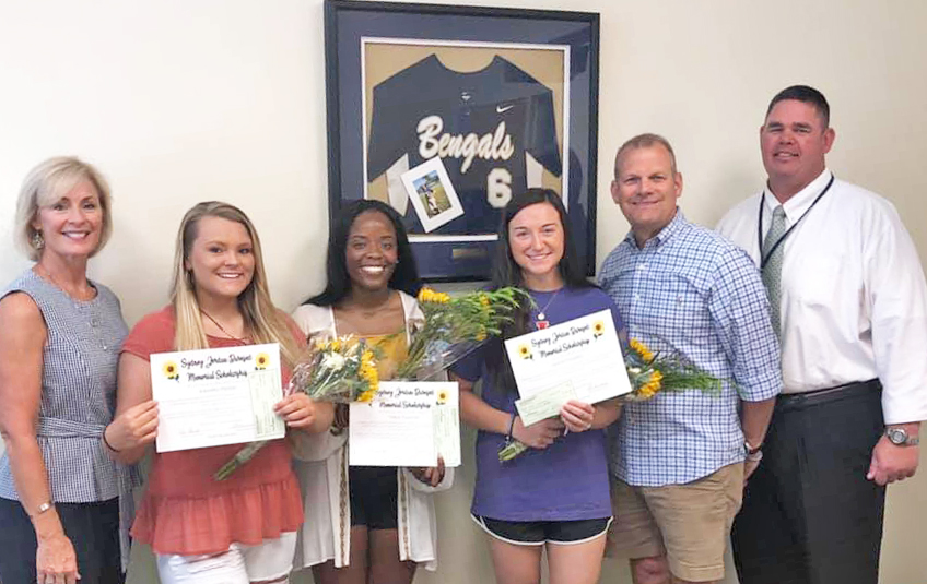 BLYTHEWOOD – Blythewood High School (BHS) softball players Kendall Parker, Grace Campbell and Taylor Fulmore received the inaugural Sydney Burnsed Scholarship. Presenting the award are Sydney’s parents, Shelley and John Burnsed and BHS principal Matthew Sherman, far right. Sydney, a former BHS softball team member, died in an auto accident in March 2018.