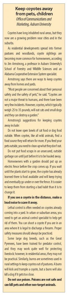 Chastain complained that she has not been able to find any government agency that will help with coyote control in her area. In fact, no local or state government agency is charged with coyote removal in South Carolina – or apparently in any other Southeastern state.