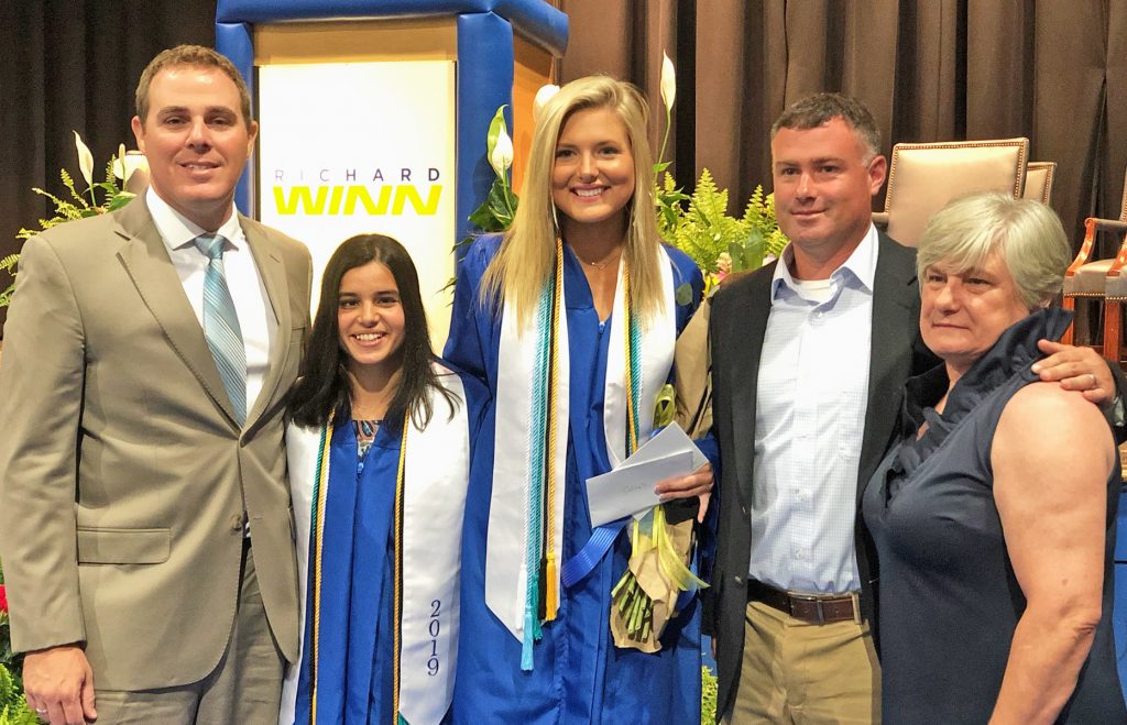 WINNSBORO – Ryan Sharpe, left, Heath Caldwell and Cheryl Caldwell presented 2019 Jenni Sharpe Memorial Scholarships to Hannah Gibbons, left center, and Caleigh Caldwell at Richard Winn’s graduation on May 16. Sharpe will also present the scholarship to Fairfield Central seniors at Class Night on June 5.