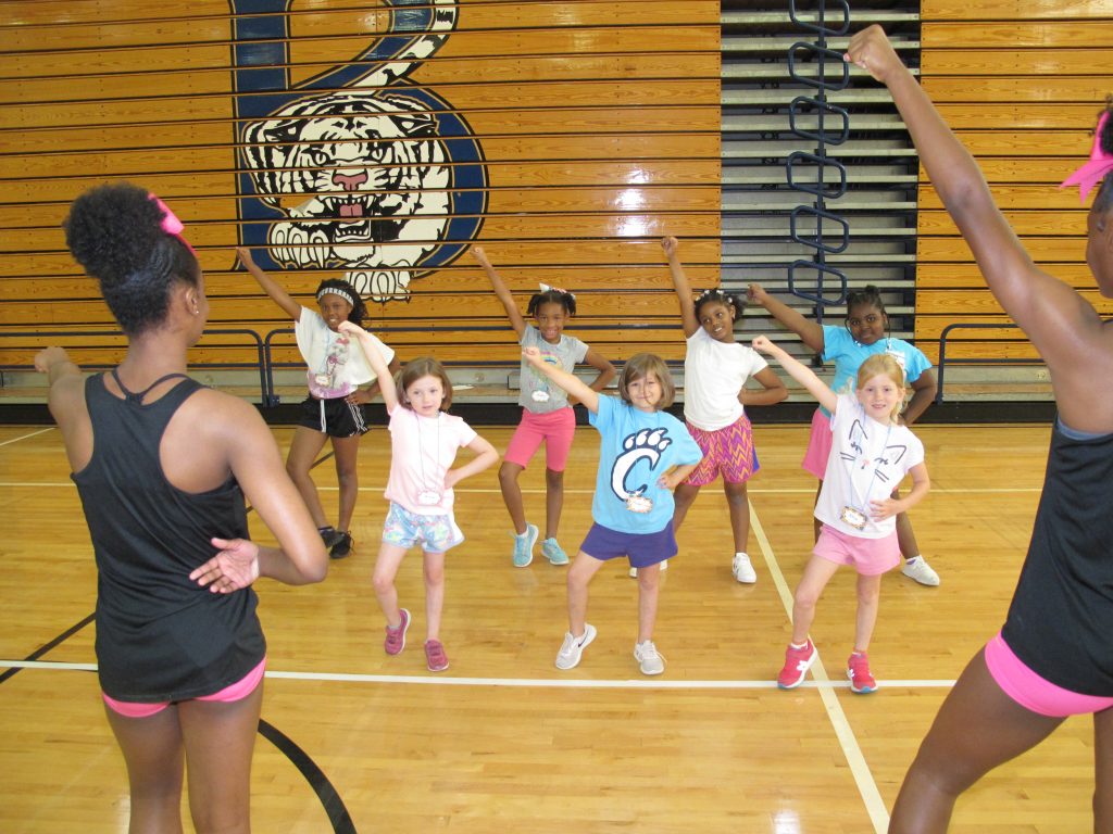 BLYTHEWOOD – A future crop of almost 60 young cheerleaders are spending the week at Blythewood High School’s cheer camp learning from two of the best –  BHS cheerleaders Ocianna Brown, left and Camilla Cl-Amin. Learning the ropes are, front row, from left: Anna Coffee, Madelyn Connor and Allie Powell. Back row, from left: Amyah Palmer, Nadia Butler, Ariyah Byrd and Payton Henderson.