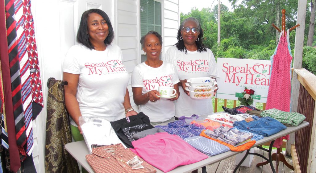 Janet Nelums, left, assistant pastor of Speak to My Heart Ministries, displays some of the new and used items the ministry will be giving away during its first Community Give-Away Day. Assisting with the ministry are Barbara Vaughn, center, and Helen Boulware. | Barbara Ball