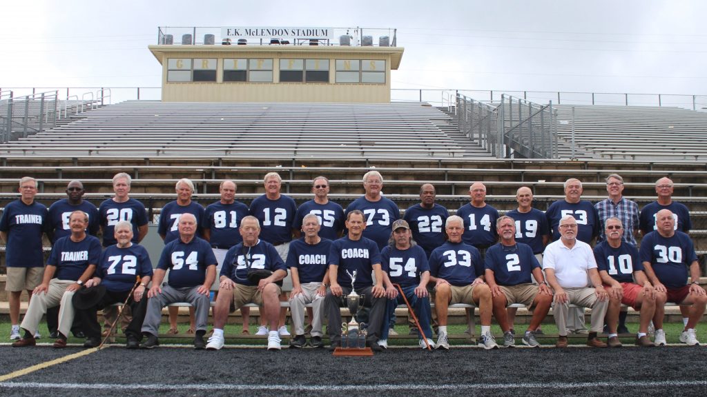 Spear-headed by Robert Sharpe and Ellis Johnson, the group came together to enjoy a BBQ dinner on Friday evening prior to the FCHS Griffins’ home opener and swap stories of what each remembered about the momentous football season. However, lengthy weather delays and continued rainy conditions of the 7:30 pm game kickoff discouraged many of the former state champs group from attending the game. However, most returned for Saturday’s brunch, a tour of the new Griffin field house given by Superintendent Dr. J.R. Green, and a group photo opportunity at McLendon Stadium.