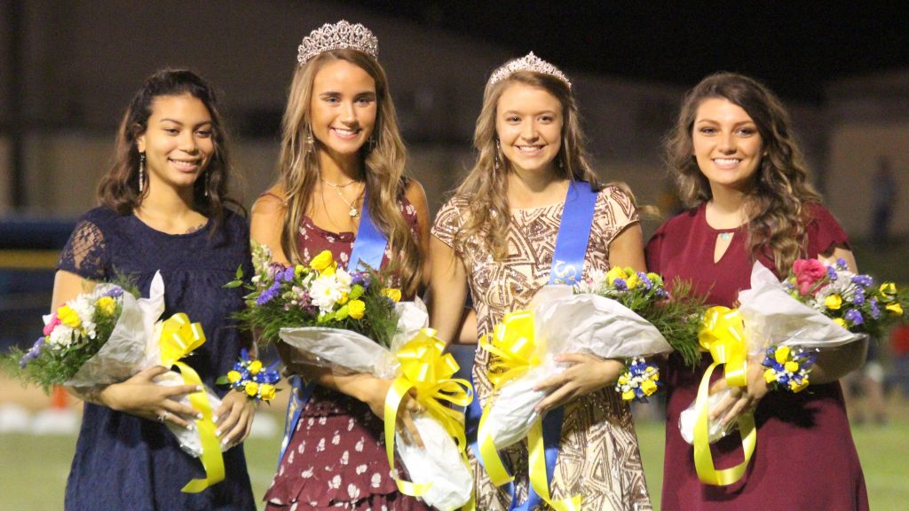 WINNSBORO – Richard Winn crowned senior Riley Simpson (center left) Homecoming Queen and Meredith Pope (center right) Football Sweetheart last Friday during halftime of their game against Jefferson Davis. Angie Otriz-Medina, left, was first runner up to Queen and Ansley Parker, right, was second runner up.