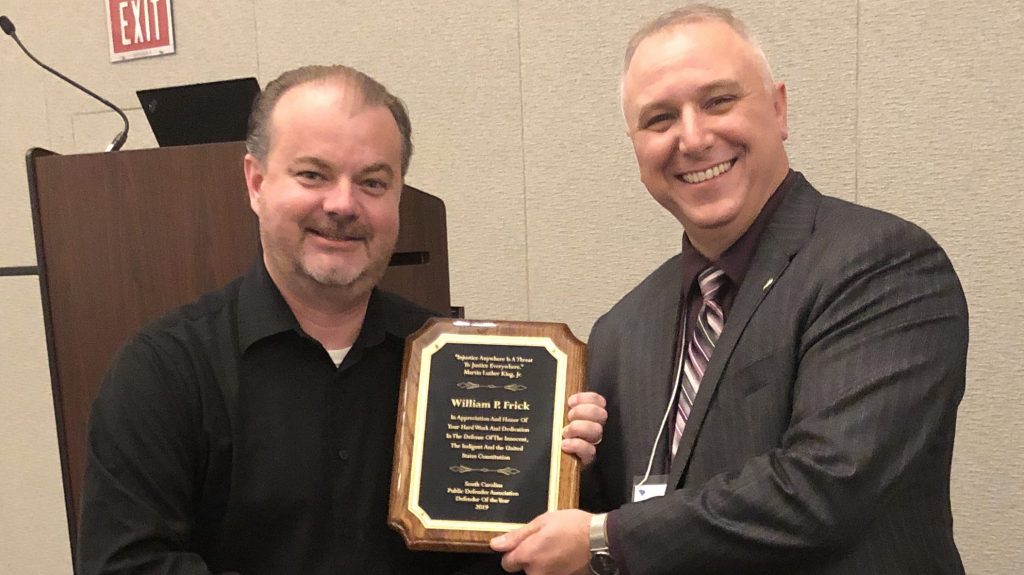 MYRTLE BEACH, SC – Sixth Circuit Deputy Public Defender William Frick was named by his peers on Monday as the 2019 South Carolina Public Defender of the Year at the South Carolina Public Defender Association Annual Conference in Myrtle Beach.