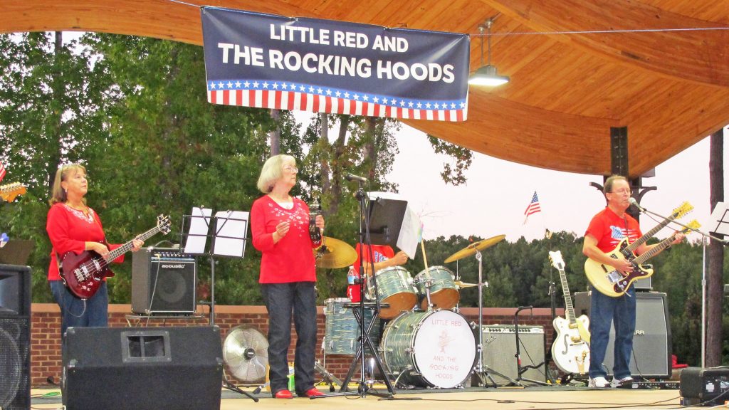 BLYTHEWOOD – Local 60’s rock band, Little Red & the Rocking Hoods, performed a free concert in the Palmetto Citizens amphitheater in Doko Park Saturday night with crowd-pleasing music from the 60’s & 70s – Ike & Tina Turner, Monkeys, Rolling Stones, Hal David, Jimmy Buffet and more. The weather was perfect and the audience appreciation was genuine.