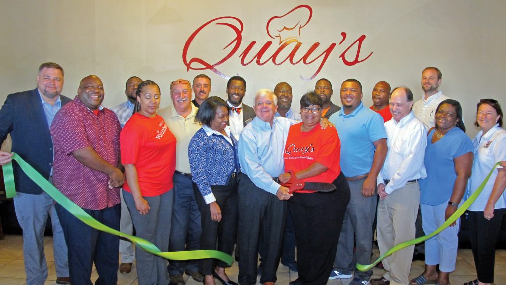 WINNSBORO – Chef Meocia Coleman, center, assisted by Winnsboro Mayor Roger Gaddy and Fairfield County Council Chairman Neil Robinson, cut the ribbon last week for Coleman’s new restaurant, Quay’s, at 1418 Hwy 321 South in Winnsboro. The grand opening will be next March, Coleman said, when the bar area will open.