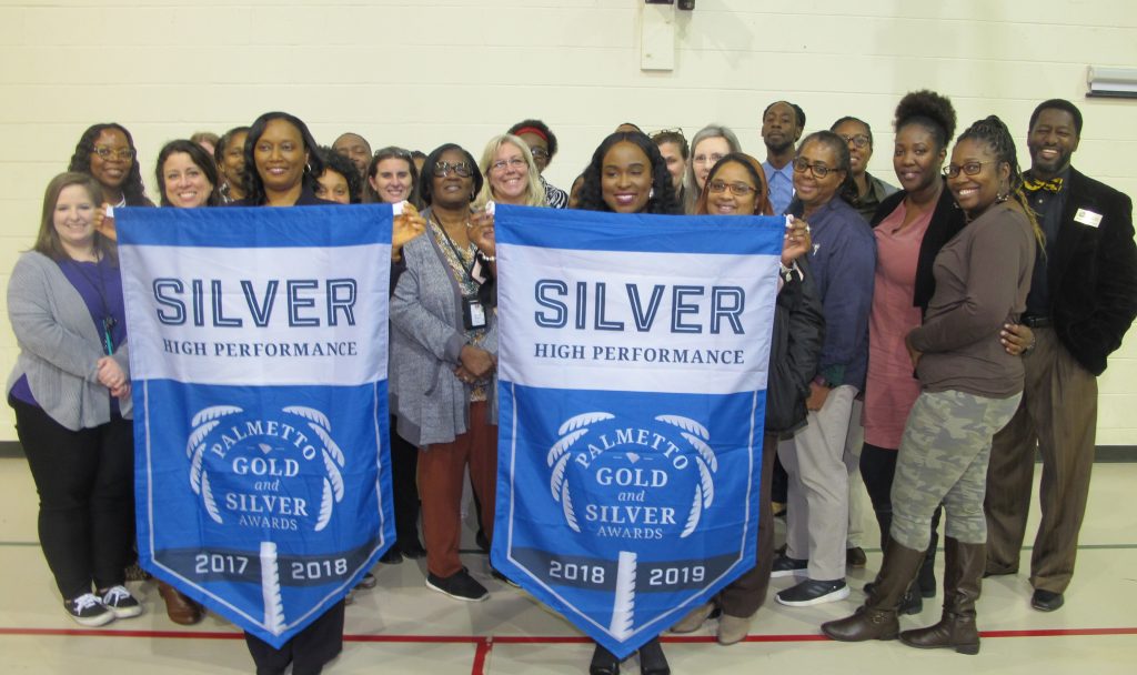 WINNSBORO – After being named one of Palmetto’s Finest schools for the second year in a row, Kelly Miller Elementary school Principal Kathy Woodard, left, and Vice Principal Faith Jones gathered with the school’s teachers and staff at the November school board meeting to show off the banners that will be displayed at the school.