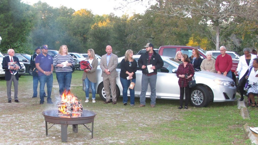 Guests moved outside, gathering on the lawn for a flag retirement ceremony led by Town Councilman and Navy veteran Eddie Baughman, who demonstrated the proper way to retire a flag in the flames.