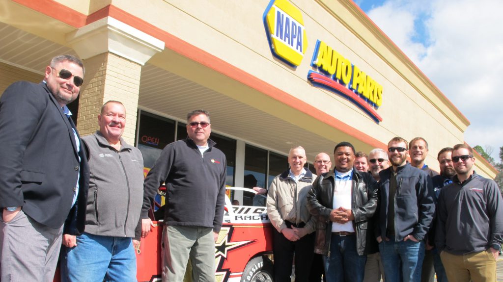 WINNSBORO – When Evan Dunbar (fourth from right) opened his new NAPA Auto Parts store in the Bi-Lo Shopping Center last week, there was lots of food and several customized vehicles were on display, including a late model dirt car that Dunbar’s store sponsors. Front row from left is Fairfield Chamber of Commerce President Gene Stevens; Roger Dunbar, underhood sales representative and Sean Middaugh, outside salesman; Mike Duffy, NAPA corporation representative; Fairfield County Council Chairman Neil Robinson and Dunbar.