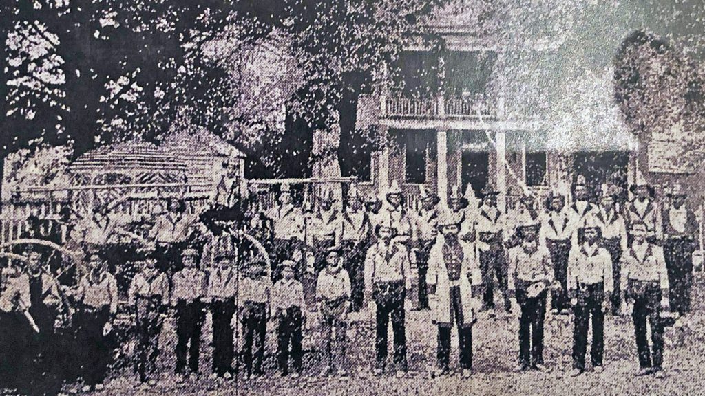 Copy with the photo states that the photo was taken 50 years earlier, placing it at about 1890. The News and Herald was able to obtain only the following names of men in the photo: John Smart, fire chief (center), Pleasant Milligan, John Wade, Brister Smith, Bill Lampkins, Bill Ford, Jim Lewis, Isum Lewis, Hamp McCockrell, Dave Kelly, Bill Light (Woodward), Anderson Woodward, Frank Woodward, West Smith, Press Montgomery, Brooks Montgomery, Paul Wright, Tom Goode, Sam Garrison, Jack Archie, John McCreight, Bob Ellison, Bob Henderson, Amber Goings, John Goings and Jessie Goings.