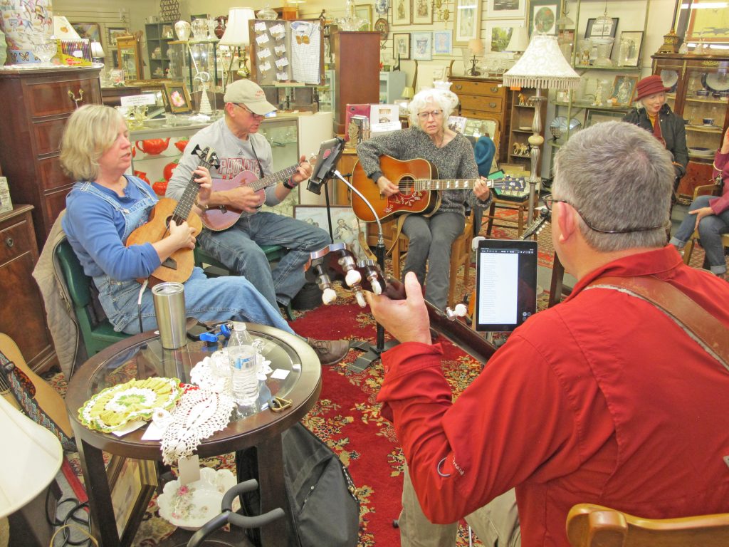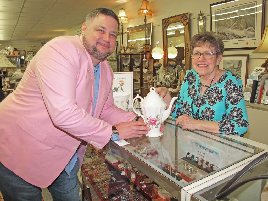 Below left, Freshed Picked band entertains customers at Oldies and Goodies. At right, Barbara Pemberton sells a pink-flowered teapot to Fairfield Chamber President Gene Stephens to go with his pink jacket.