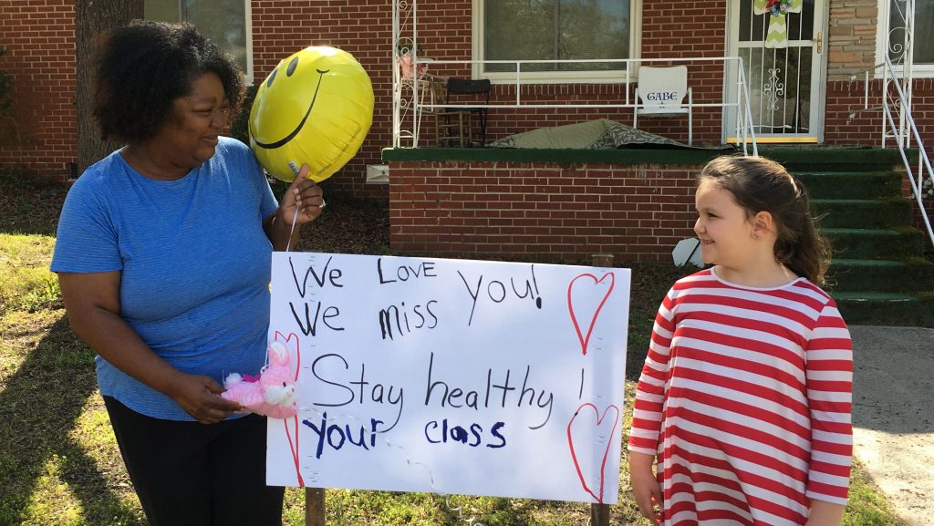 BLYTHEWOOD – Maci King, a first grade student at Bethel-Hanberry Elementary School, placed a sign in her teacher’s front yard on behalf of her class. Pictured left, Maci greets her teacher, Patricia Mack, with a balloon, stuffed animal and well wishes.