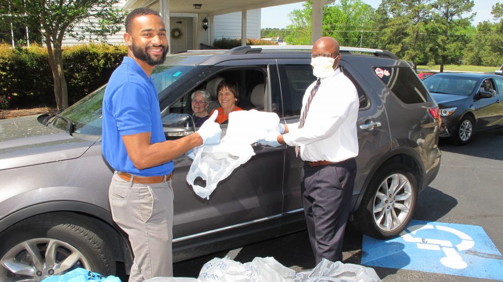 Following the church’s worship service that was live-streamed for members to watch at home, the congregants hopped into their cars and headed for the church building where they drove slowly through the parking lot. In a drive-thru type line of cars, members were handed ‘pot luck’ box lunches packed with brisket, chicken, vegetables, rice, mac and cheese and dessert. The members then returned to their respective homes and enjoyed lunch ‘together.’