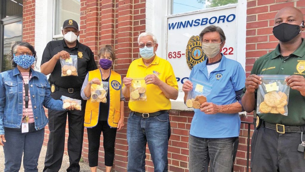 WINNSBORO – To show their appreciation to the Winnsboro Police Department, above, and the Fairfield County Sheriff’s Department for their vigilance during the Time of Corona, last week the Winnsboro Lions Club delivered 85 bags of home baked cookies to two law enforcement agencies.
