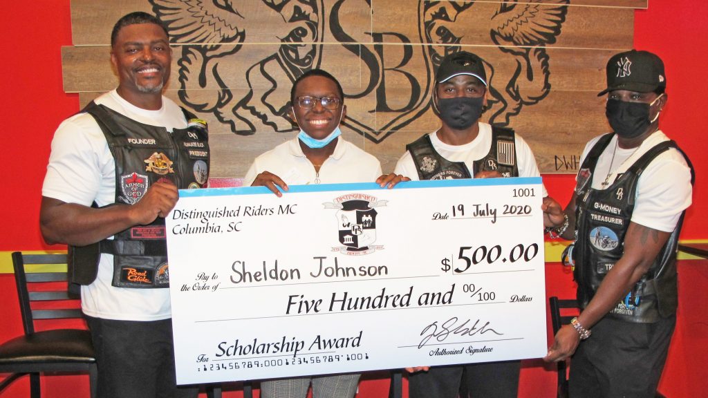 BLYTHEWOOD – Fairfield Central High School’s 2020 valedictorian Sheldon Johnson picked up another scholarship Sunday when the Distinguished Riders Motorcycle Club presented him with a check for $500 at a restaurant in Blythewood. Brian Gray, spokesperson for the club, praised Johnson, who was the third son in his family to be named valedictorian at FCHS and also served in many leadership roles during his high school career. Gray called Johnson exemplary as a scholar and as a person. Johnson will attend Clemson University in the fall.