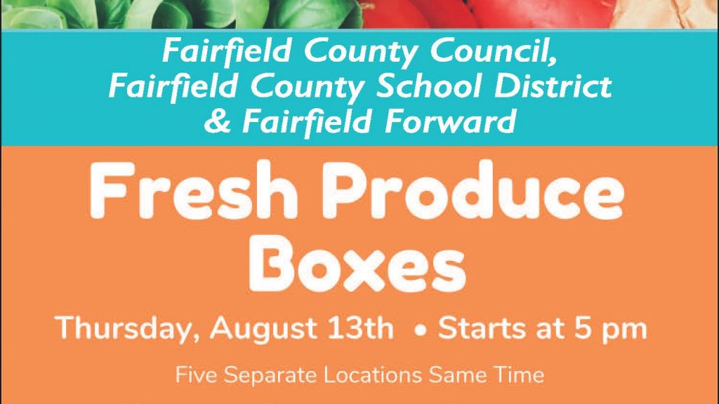 WINNSBORO – The sixth Fairfield County distribution of free boxes of fresh produce is scheduled for distribution at five separate locations at the same time – Thursday, Aug. 13, at 5 p.m.