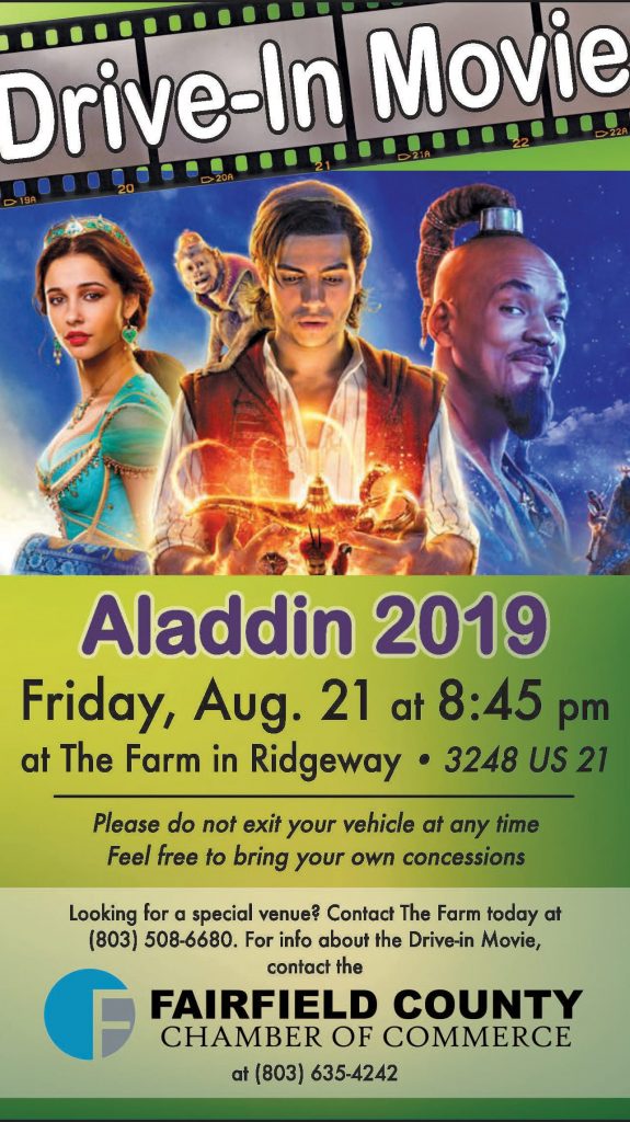 RIDGEWAY – If you enjoyed The Lion King at the Fairfield Chamber of Commerce’s drive-in movie last month, you won’t want to miss Aladdin at the Chamber’s next drive-in movie to be held at The Farm in Ridgeway. This special venue offers a bucolic setting in the quiet countryside.