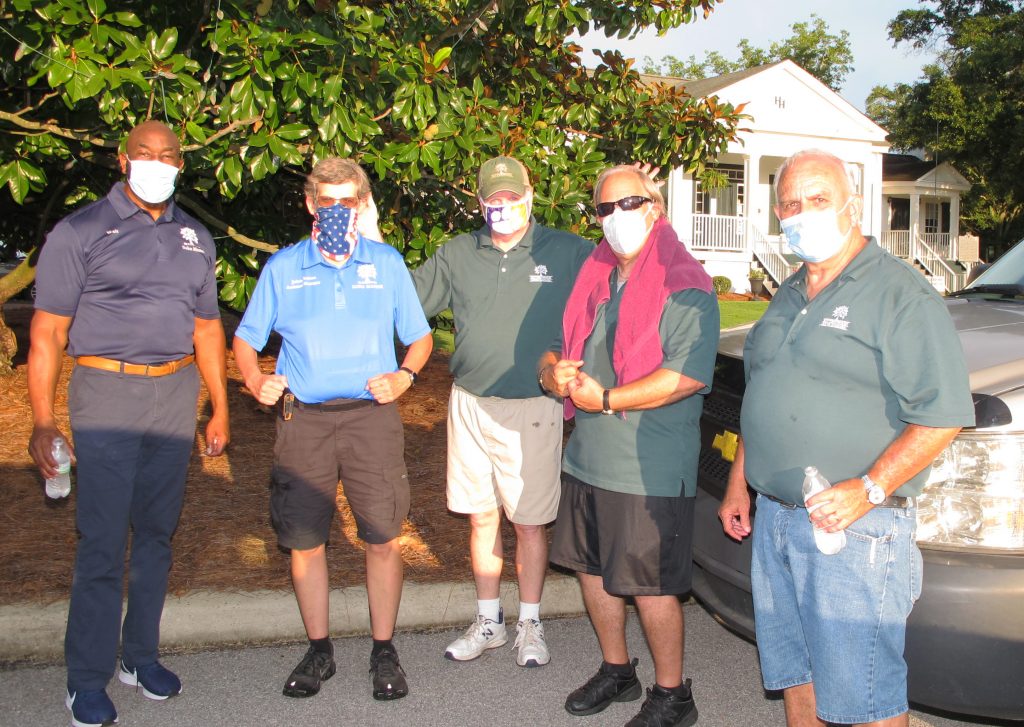 BLYTHEWOOD – Displaying the sign that designates Blythewood as a Purple Heart Town are, from left: Mayor Pro Tem Eddie Baughman; Brigadier General Milford Beagle, Jr., Commander, Fort Jackson; Purple Heart recipient First Sergeant (Ret.) Brian Nolan; Command Sergeant Major (Ret.) Carl Lopez; Mayor Bryan Franklin and LTC (Ret.) Cary Bond, Commander of the S.C. Chapter of the Buffalo Soldiers Motorcycle Club.