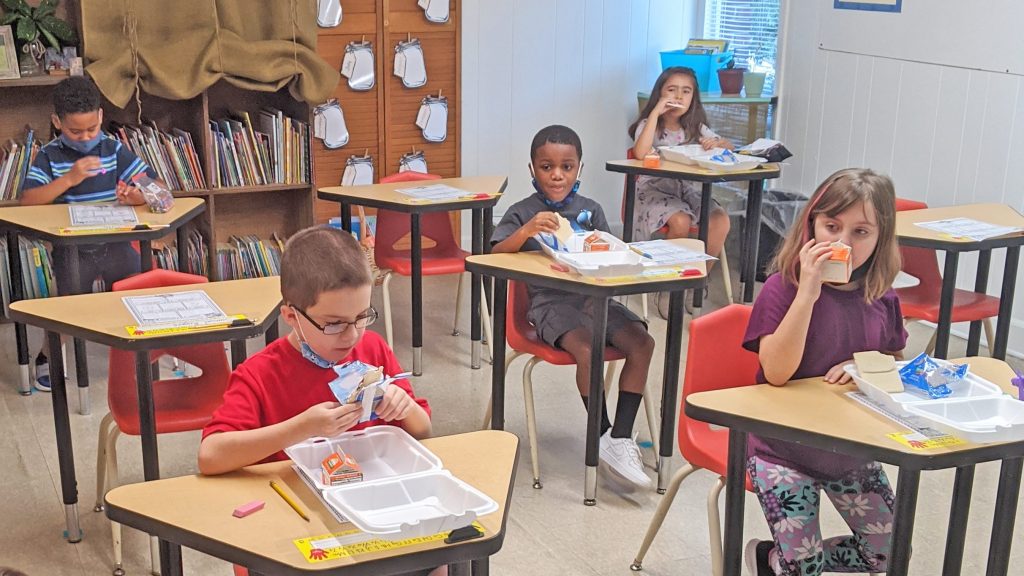 WINNSBORO – The school day was a little different for students at Midlands STEM Institute during their first day of the year on Monday. Pictured above, students eat boxed lunches at their desks.