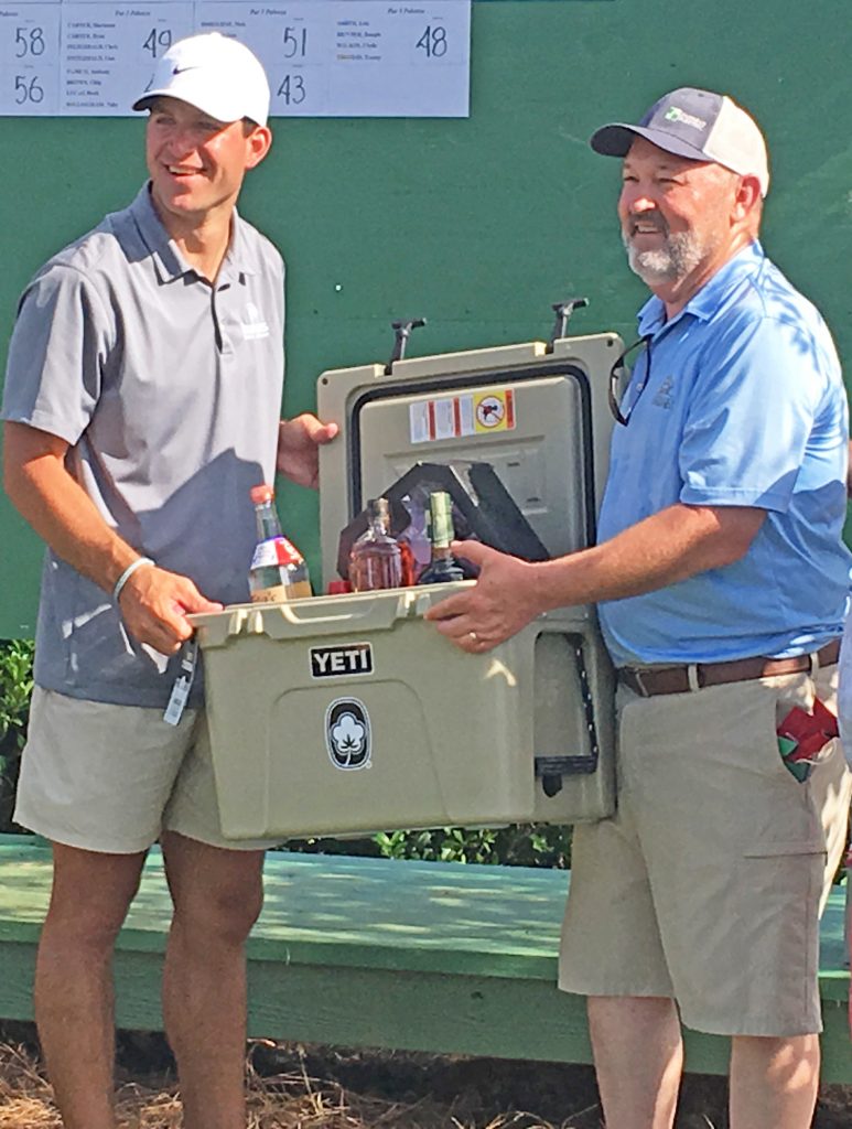 Cauthen presents Joseph Hunter, winner of the putting contest, a Yeti cooler.