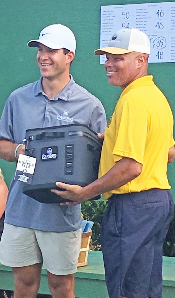 Trey Cauthen, left, of Founders Federal presented a Yeti cooler full of liquor to Doug Payne, the day’s grand prize raffle winner.